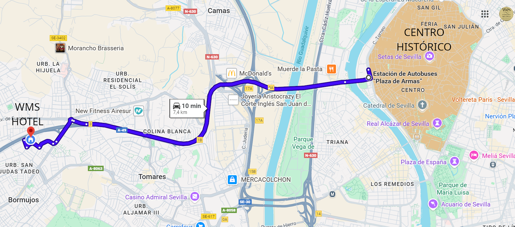 Adicionalmente a los medios de transporte privados (vehículo propio/alquilado, taxi, uber etc), el municipio de Bormujos se encuentra conectado con la ciudad de Sevilla mediante transporte público a través de líneas de autobús metropolitano. Por lo tanto es perfectamente factible para cualquier participante no residente, incluso sin disponer de coche (propio o alquilado) poder llegar desde el hotel sede de WMS a las zonas de Sevilla con mayor interés turístico.