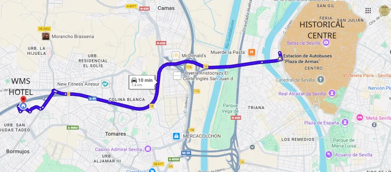 In addition to private means of transport (own/rented vehicle, taxi, Uber, etc.), the municipality of Bormujos is connected to the city of Seville by public transport through metropolitan bus lines. Therefore, it is perfectly feasible for any non-resident participant, even without having a car (owned or rented), to travel from the WMS host hotel to the areas of Seville with the greatest tourist interest.